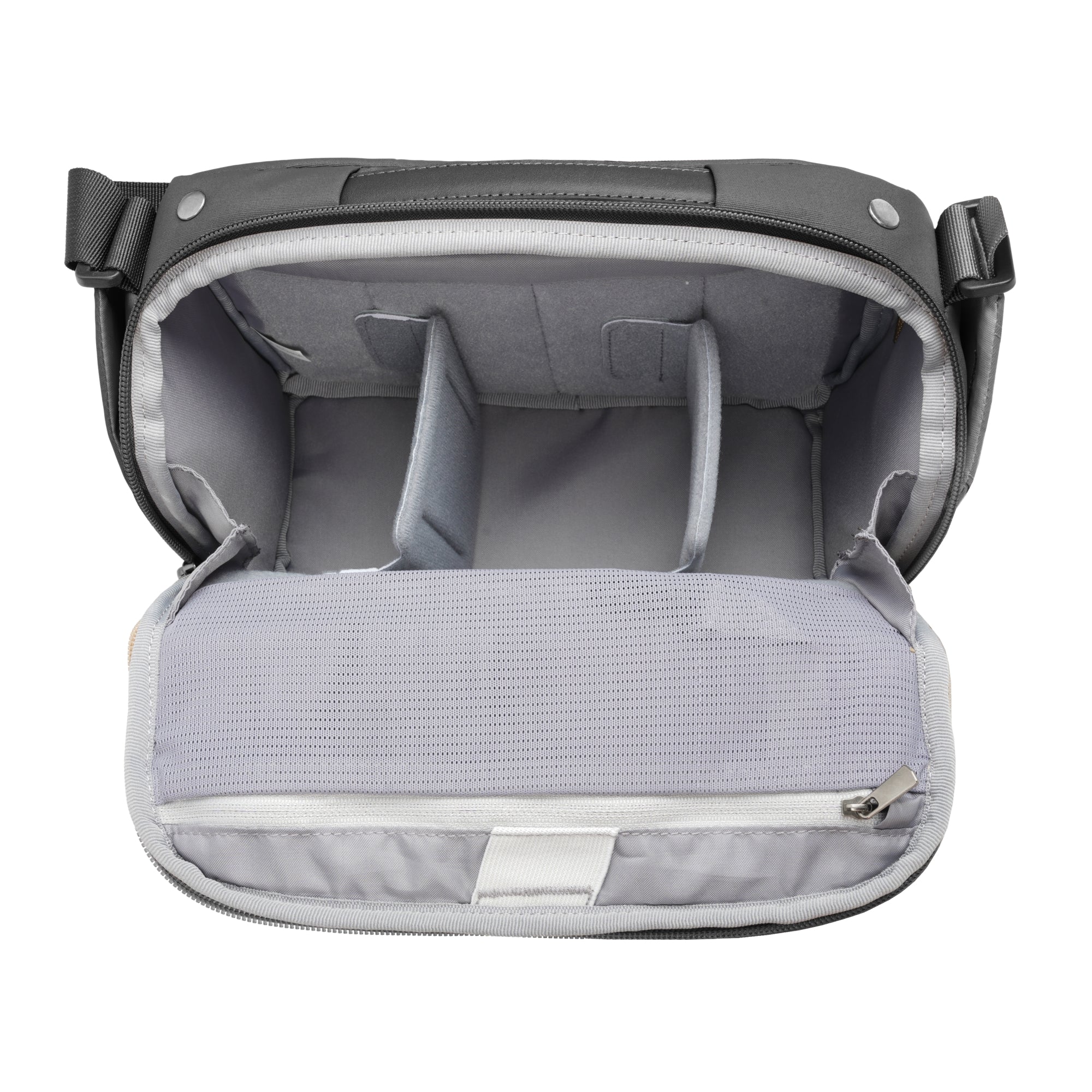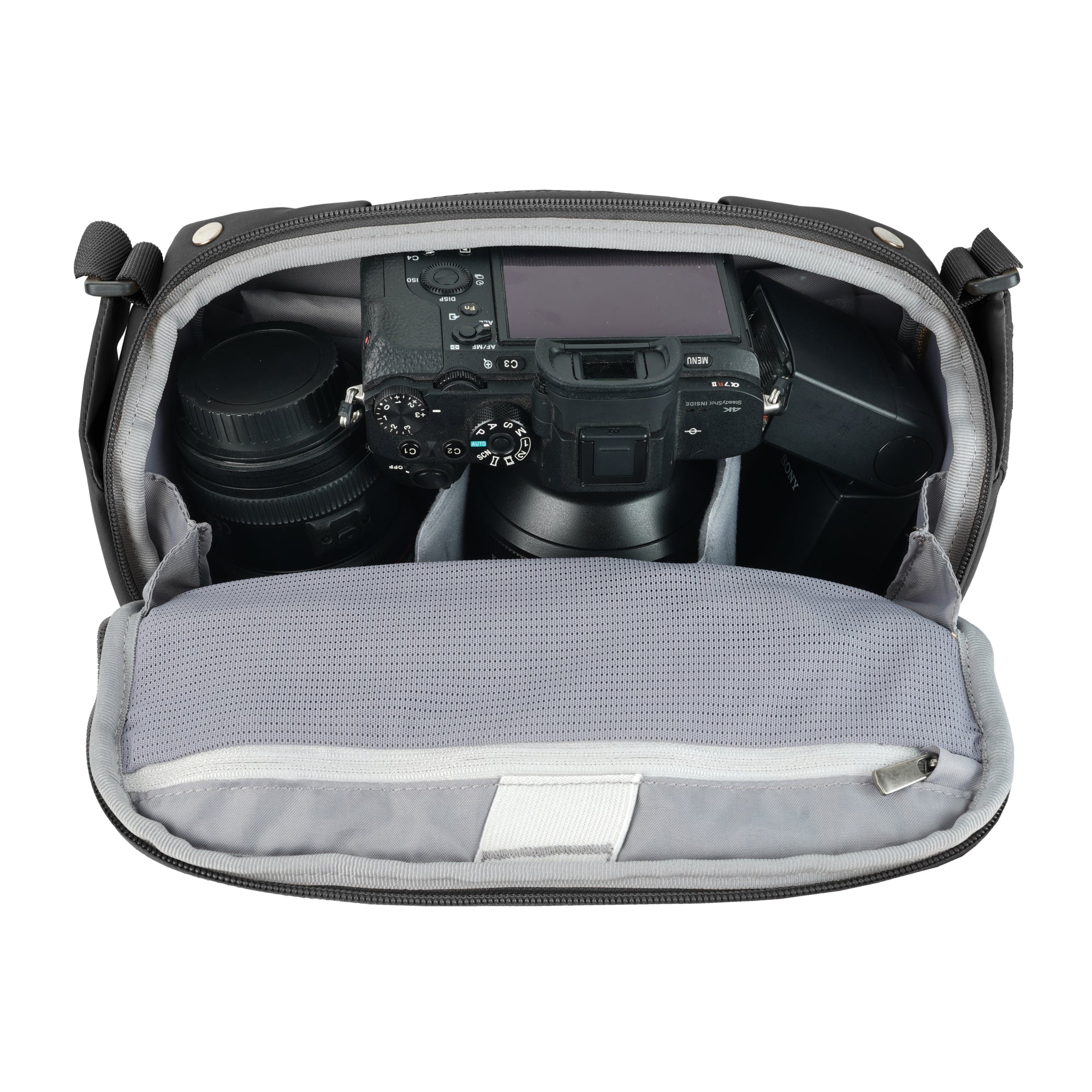 The camera compartment allows you to carry a full-frame camera with up to 2 lenses (up to 24-70mm f2.8), or a small drone, separated by slimline EVA dividers that are designed to maximize the space available while protecting your gear. You can adjust the dividers to your preferred layout or remove them to create an everyday shoulder bag. Enjoy full access to the camera compartment through the top of the bag, which opens away from the body for maximum security.
