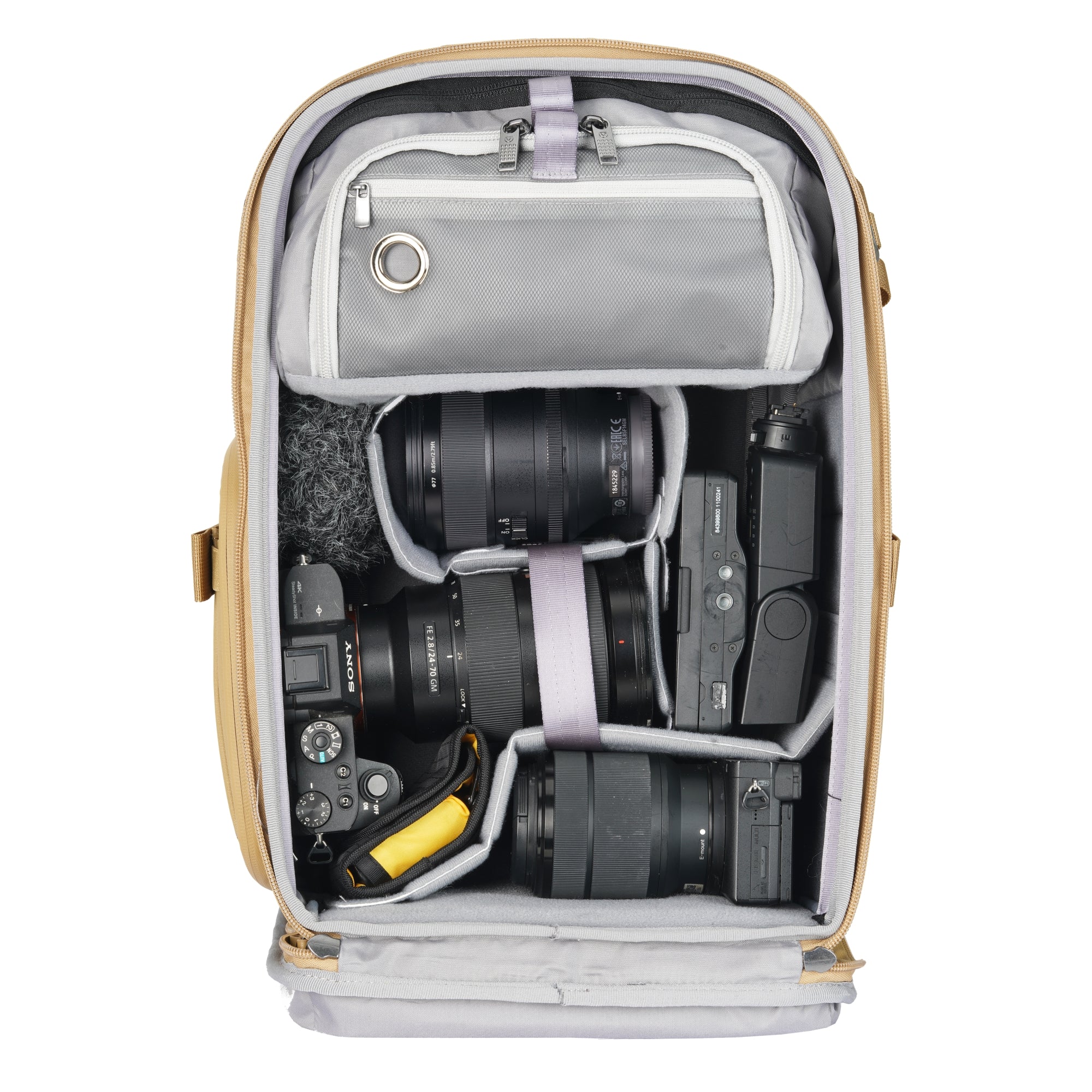 The camera compartment allows you to carry a full-frame camera with up to 3 lenses (up to 70-200mm f2.8), separated by slimline EVA dividers that are designed to maximize the space available while protecting your gear. You can adjust these dividers to your preferred layout or remove them to create an everyday backpack. Enjoy full access to the camera compartment through the back, with quick top access to your camera -- so you can be ready to shoot in seconds.